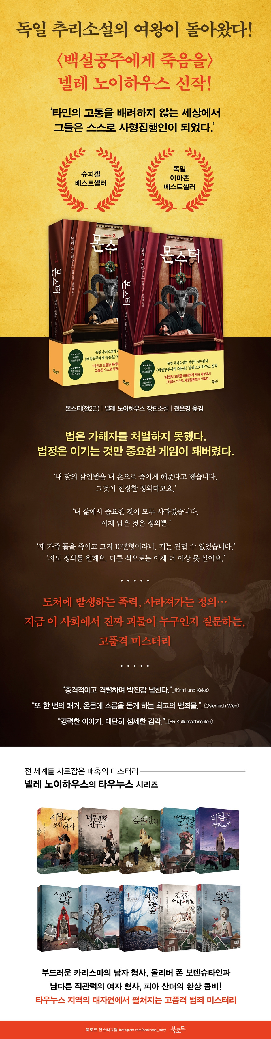 독일의 베스트셀러 작가 넬레 노이하우스(Nele Neuhaus)의 신작 『몬스터』가 드디어 한국 독자들을 찾아왔습니다. 유럽에서 20년 가까이 사랑받아온 '타우누스 시리즈'의 열한 번째 작품인 이 소설은, 사적 제재(私的制裁)라는 현대 사회의 뜨거운 이슈를 다루며 독자들에게 정의의 본질에 대해 깊이 있는 고민을 던집니다.
